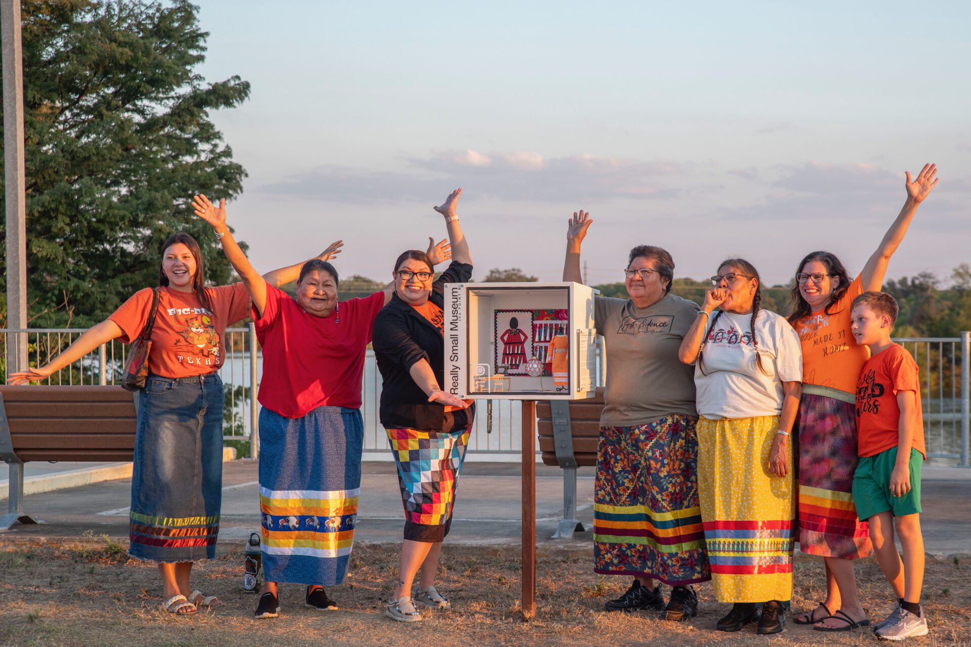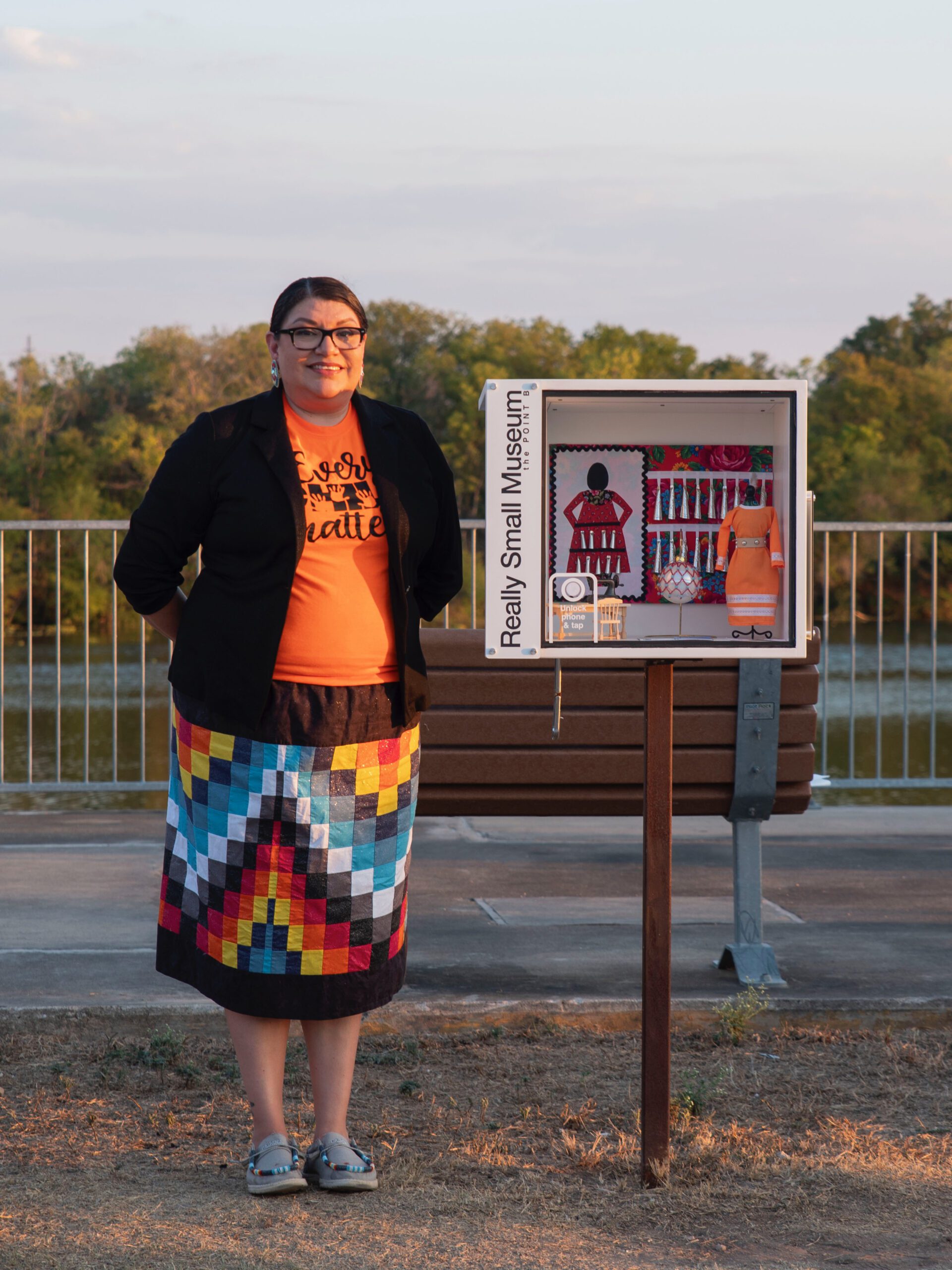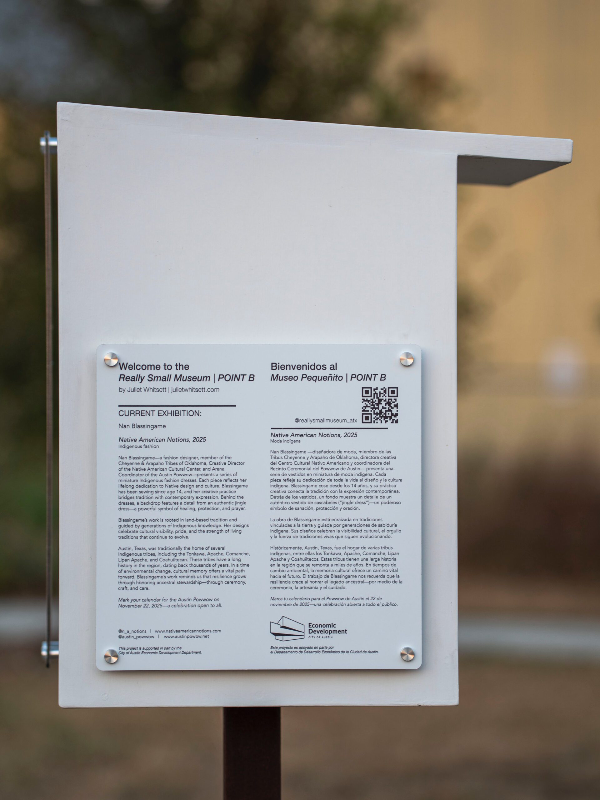 Nan Blassingame—a fashion designer, member of the Cheyenne & Arapaho Tribes of Oklahoma, Creative Director of the Native American Cultural Center, and Arena Coordinator of the Austin Powwow—presents a series of miniature Indigenous fashion dresses. Each piece reflects her lifelong dedication to Native design and culture. Blassingame has been sewing since age 14, and her creative practice bridges tradition with contemporary expression. Behind the dresses, a backdrop features a detail from an authentic jingle dress—a powerful symbol of healing, protection, and prayer.