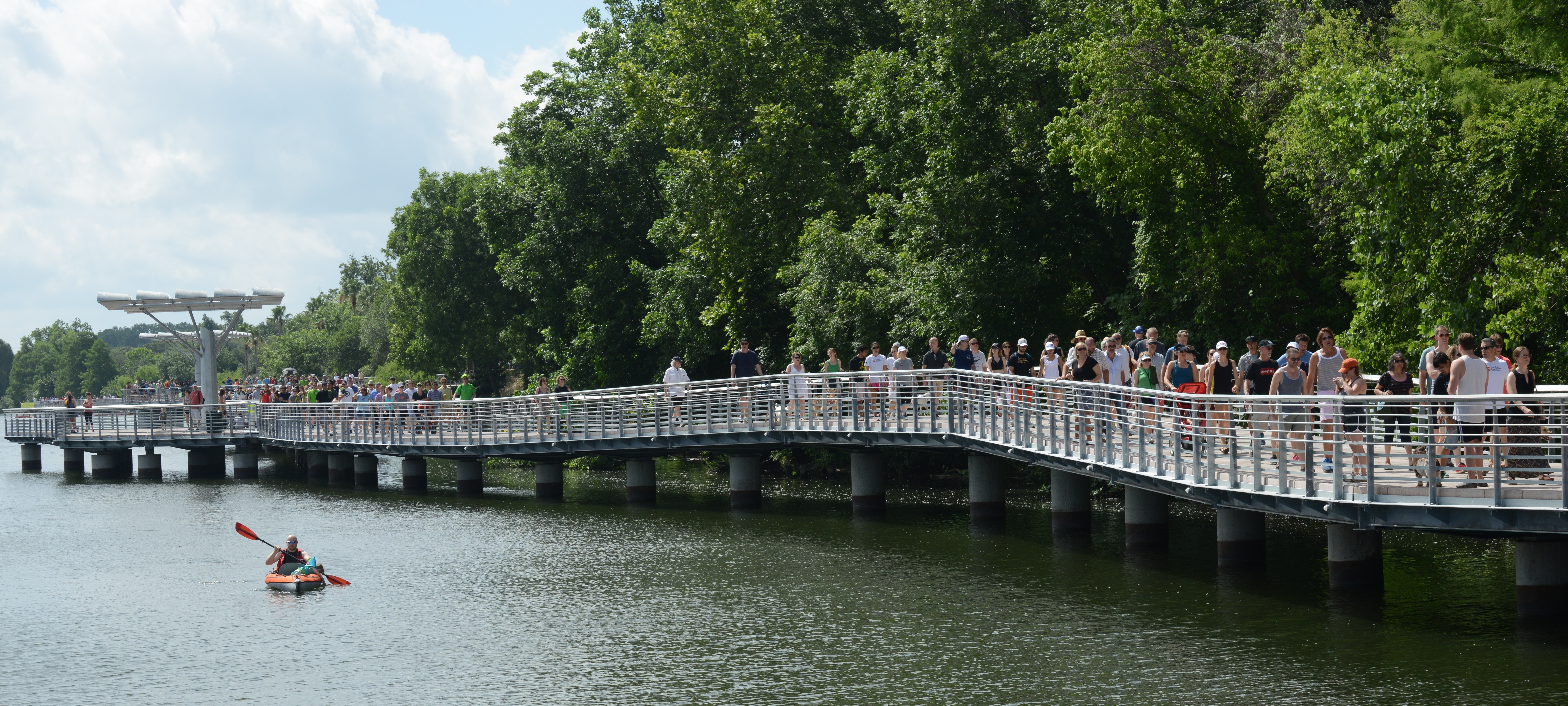 In partnership with the city of Austin, appropriated funds for preliminary design, engineering, and public involvement for the Boardwalk at Lady Bird Lake began in 2008. In 2010 and 2012, Austin voters approved additional bond funding, accompanied by a generous list of donors coordinated by the Trail Conservancy. Construction started in October 2012 and was completed in early June 2014.